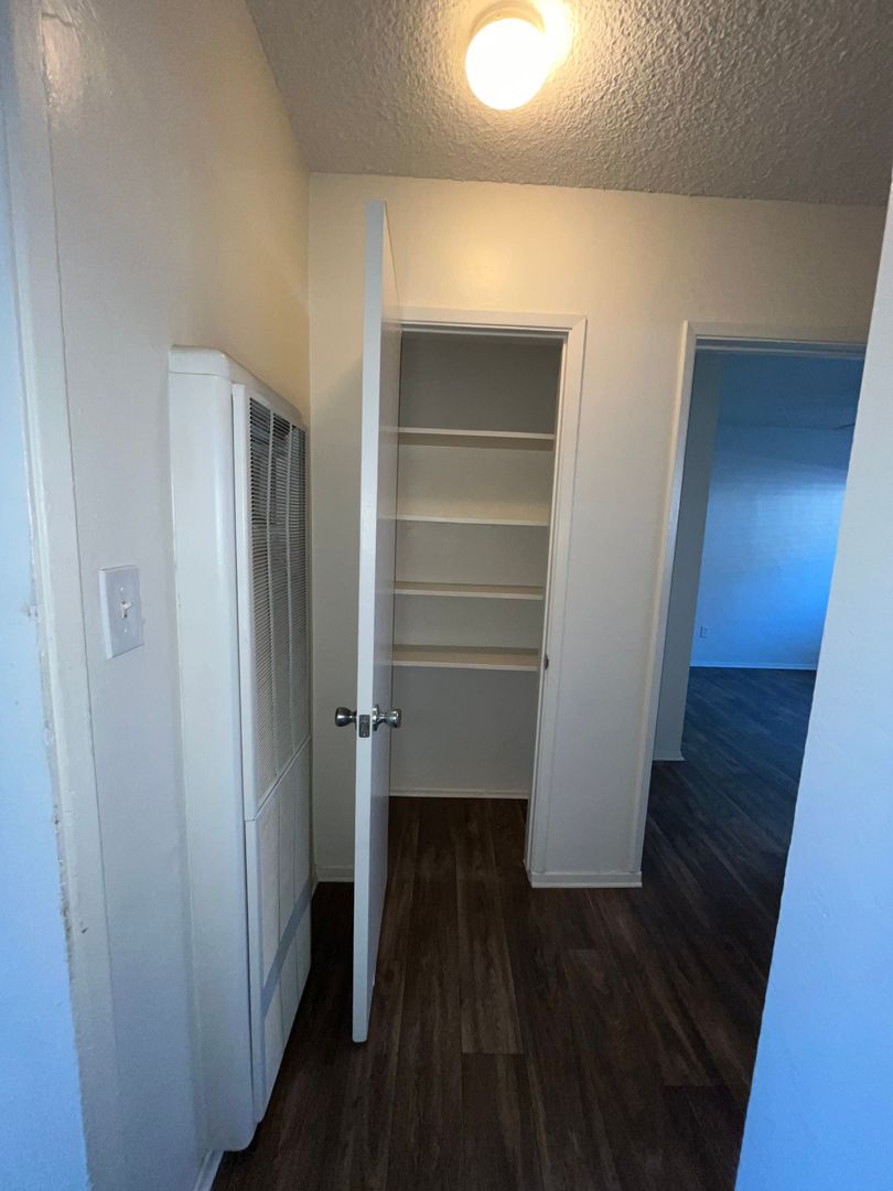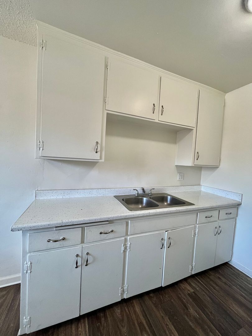 Step into a bright home with an all-white kitchen, an open and airy living room, vinyl flooring throughout, and generously sized bedrooms with extra storage space.