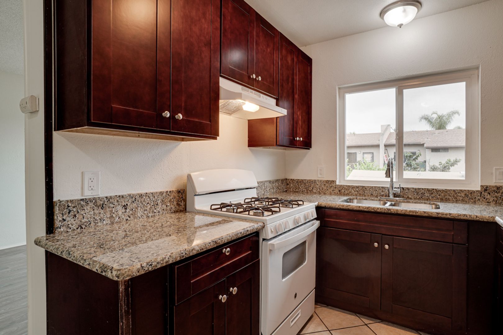This light-filled home features durable vinyl plank flooring in the living areas, plush carpet in the bedroom, and a clean, updated kitchen with granite countertops, rich wood cabinetry, and a gas stove. The spacious bedroom includes a large closet, while the bathroom offers classic tile finishes and a full bathtub.