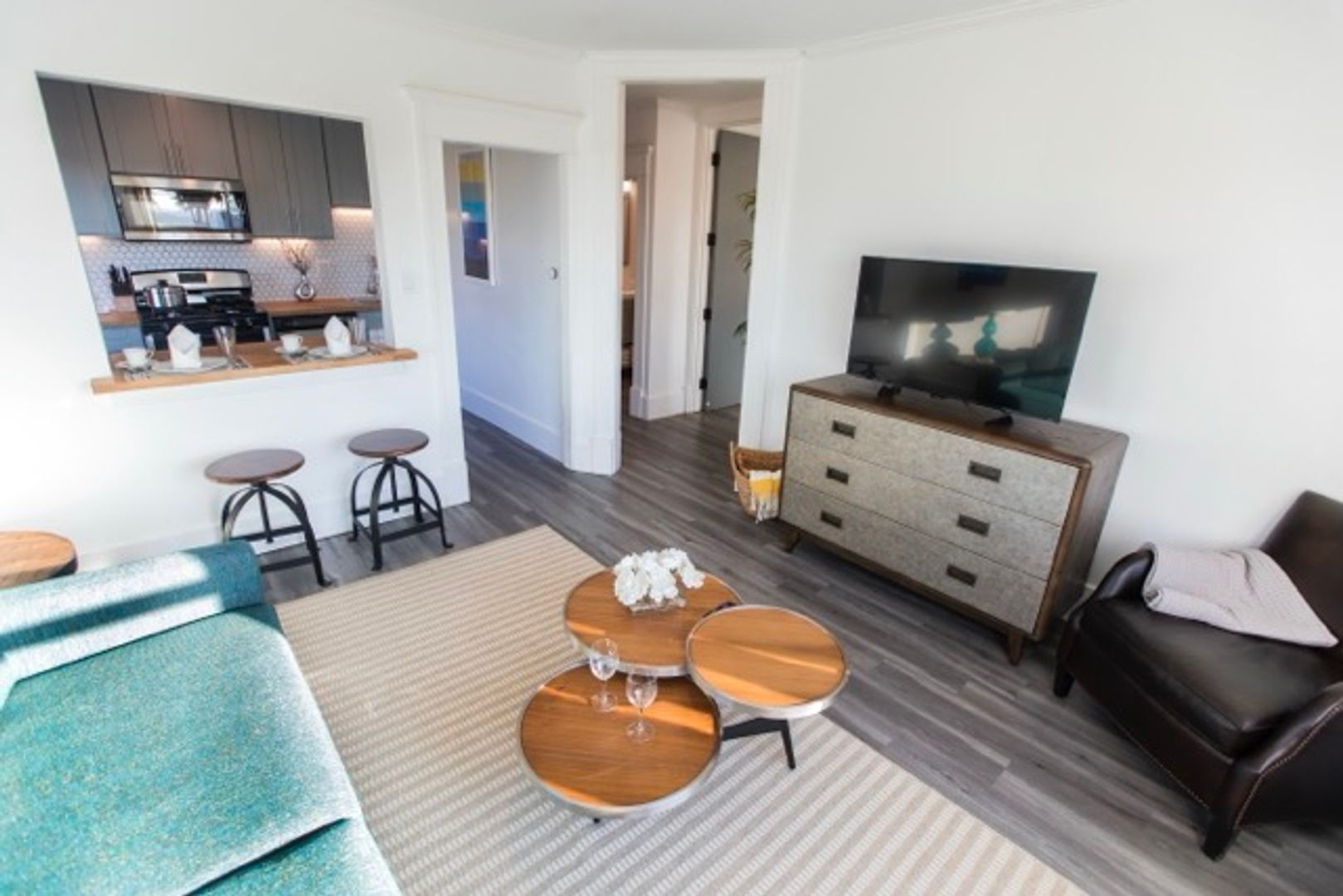 Open-concept floor plan with vinyl plank flooring